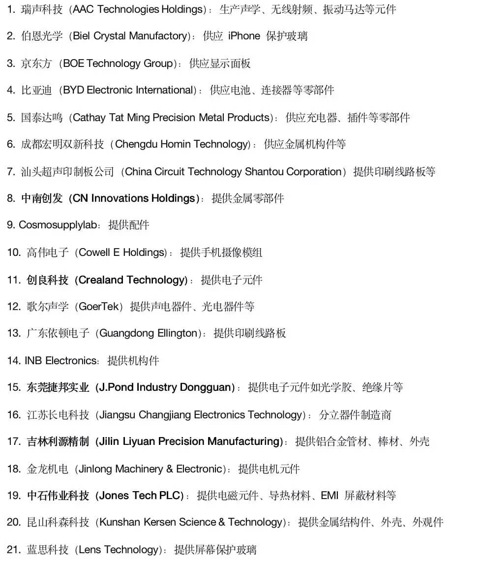 下面为2019年苹果200大供应商名录: